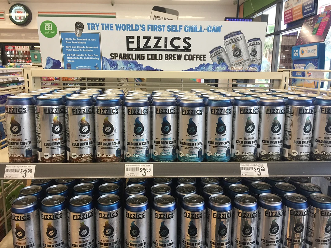 Sieć 7-Eleven wprowadziła do oferty serię cold brewów zamkniętych w samochłodzącycn się puszkach. Puszki napojów Fizzics Sparkling Cold Brew Coffee zostały stworzone przez firmę The Joseph Company International.Założyciel firmy - Joseph Mitchell - stworzył prototyp samochłodzącego się napoju wykorzystujący system chłodziwa oparty o HFC, czyli fluorowane alkany, zbudowane z trzech pierwiastków: H, F, C. Niestety, substancje te uznano za gazy cieplarniane i zostały zabronione przez Agencję Ochrony Środowiska (EPA).W 2012 r. pojawiła się wersja chłodziwa oparta na CO2, która nie wydaje się być tak niebezpieczna dla środowiska jak poprzednia. To właśnie ten projekt został przechwycony przez sieć 7-Eleven. Kawa jest dostępna na próbę w okolicach Los Angeles.Gdy puszki mają być schłodzone, dysza u podstawy puszki uwalnia CO2 z charakterystycznym dźwiękiem. Konsumenci muszą poczekać tylko 1,5 minuty, po czym napój zostaje schłodzony do temperatury około 16,7oC. Szczegółowa zasada działania technologii jest owiana tajemnica.