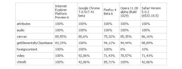 Przeglądarkę Microsoftu porównano z Google Chrome 7.0.517.41 beta, Firefox 4 Beta 6, Opera 11.00 alpha (build 1029) oraz Safari Version 5.0.2 (6533.18.5). Oczywiście przedstawiony poniżej test to jedynie część HTML-a, a sam HTML stanowi niewielką część zawartości WWW. Rzecz jest jednak warta odnotowania, gdyż może wskazywać, że koncern z Redmond zaczął poważniej traktować międzynarodowe standardy i chce z IE9 uczynić nowoczesną konkurencyjną przeglądarkę.