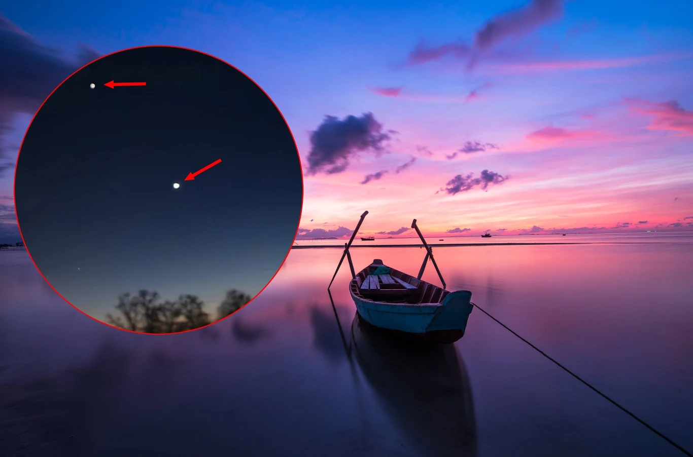 Ten spektakl, który wielu przypadkowych gapiów zaobserwowało na wieczorowym niebie, okazuje się być zatem urokliwym spotkaniem Jowisza i Wenus. Jowisz obecnie się od nas oddala, lecz mimo to zachowuje imponującą jasność. Spośród dwóch jasnych punktów na zachodnim niebie jest on tym, który znajduje się wyżej od Wenus.