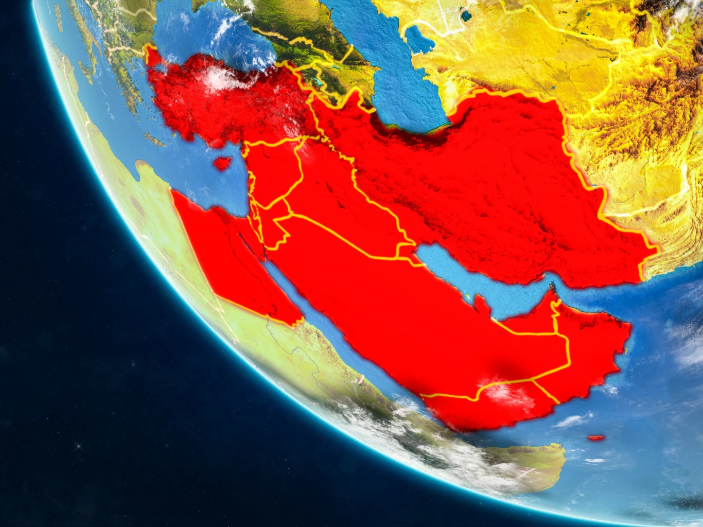 W związku z jego strategicznym położeniem na styku trzech kontynentów przyciąga uwagę światowych mocarstw takich jak Stany Zjednoczone, Rosja i Chiny. Te rozgrywki prowadzone są wraz z lokalnymi potęgami, takimi jak Turcja, Arabia Saudyjska, Izrael czy Arabia Saudyjska. Oliwy (niemal dosłownie) do ognia dolewają znajdujące się na tych terenach istotne dla gospodarki świata zasoby ropy naftowej i gazu ziemnego. A w związku z tym, że są to tereny pustynne, to poszczególne państwa chcą kontrolować w jak największym stopniu rzeki oraz ich źródła. Na interesy polityczne nakładają się dodatkowo różnice religijne, kulturowe, etniczne i klanowe.