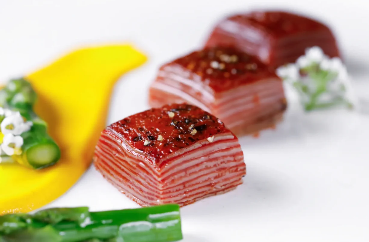 "Wagyu" od Steakholder Foods powstało w podobny sposób, czyli wszystko zaczęło się od wyizolowania komórek macierzystych z naturalnej tkanki wołowej, ich rozmnożenia, a następnie przekształcenia w specjalny biotusz - jedyna różnica sprowadza się do tego, że teraz, zamiast mieszać wszystkie komórki razem, warstwa mięsa i tłuszczu była drukowana osobno, dzięki czemu powstał charakterystyczny wzór.