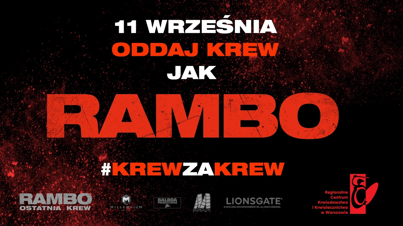 Z okazji zbliżającej się wielkimi krokami premiery filmu "Rambo: Ostatnia krew" Monolith Films i Regionalne Centrum Krwiodawstwa w Warszawie zapraszają do akcji, w której można uczynić dużo dobrego, a do tego zgarnąć gadżety związane z najnowszą częścią przygód Johna Rambo.