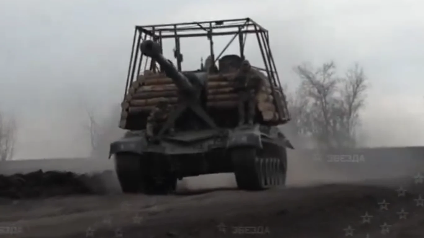 Rosyjscy żołnierze pokazali zmodyfikowaną samobieżną artylerię 2S19 Msta-S dla telewizji ZvezdaNews. Widać na nim wręcz maszynę, która odnalazłaby się na planie jakiegoś filmu postapo. Dodano do niej bowiem już standardowy na froncie metalowy dach oraz... pancerz z ułożonych bel drewna.