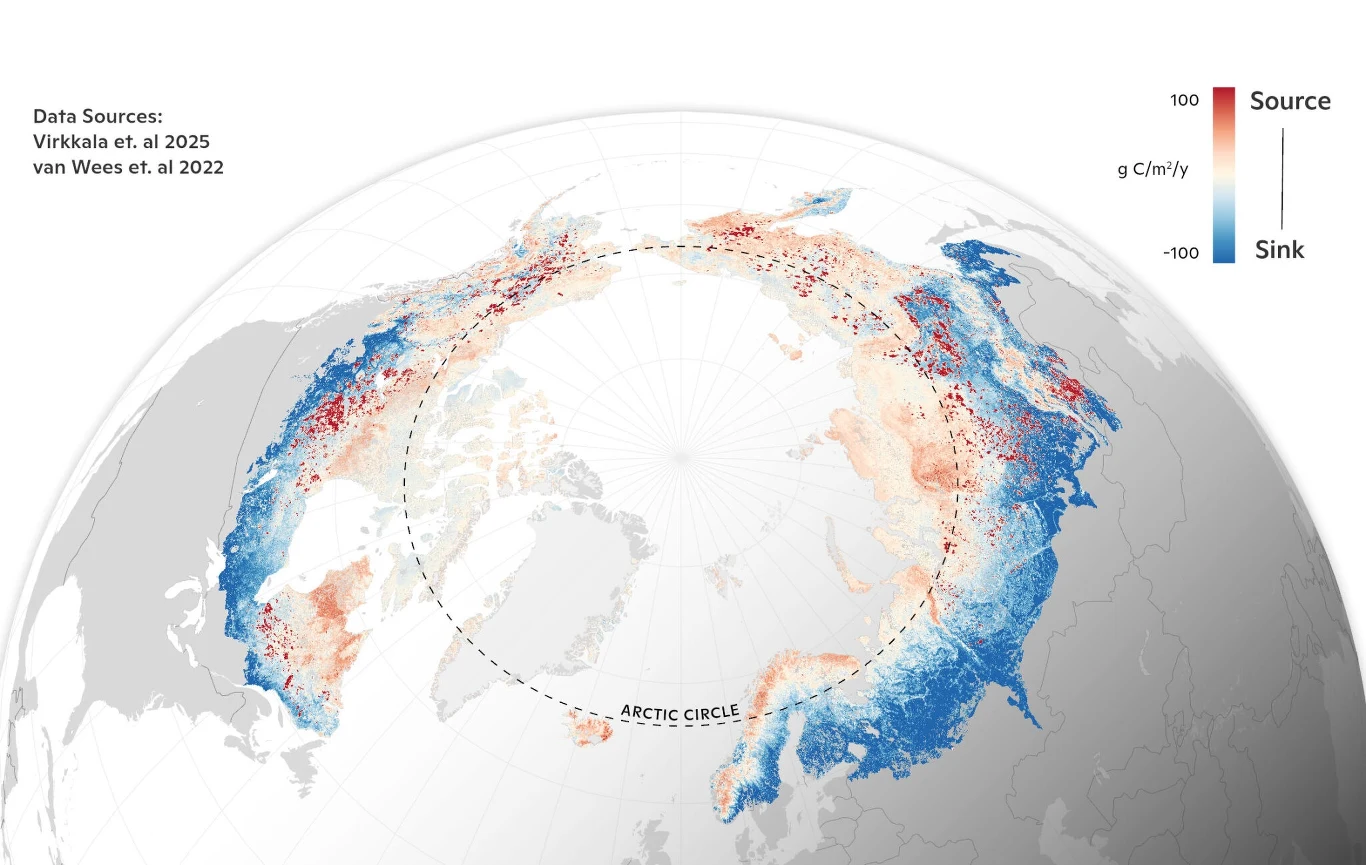 Jednym z obszarów, które pełnią istotną rolę w zachowaniu równowagi dwutlenku węgla na Ziemi, jest strefa arktyczno-borealna (ABZ), obejmująca tundrę, lasy borealne i mokradła wokół koła podbiegunowego północnego. Najnowsze badania pod kierownictwem naukowców z Woodwell Climate Research Center w Massachusetts wskazują, że jedna trzecia (34 proc.) tej strefy, zamiast pochłaniać węgiel, emituje go do środowiska. Bilans ten składa się z dwutlenku węgla pobieranego przez rośliny w procesie fotosyntezy oraz dwutlenku węgla uwalnianego do atmosfery poprzez oddychanie mikrobiologiczne i roślinne. Po doliczeniu emisji pochodzących z pożarów, odsetek ten wzrasta do 40 proc.