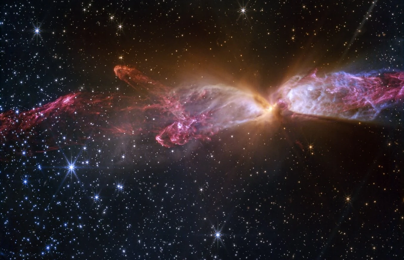 Kosmiczny Teleskop Jamesa Webba dostarcza niesamowite widoki wszechświata. Na nowym zdjęciu z potężnego obserwatorium uchwycono ciekawe zjawisko. Wygląda jak "kosmiczna klepsydra", a w rzeczywistości jest to widok dwóch młodych gwiazd, które są oddalone od nas o kilkaset lat świetlnych.