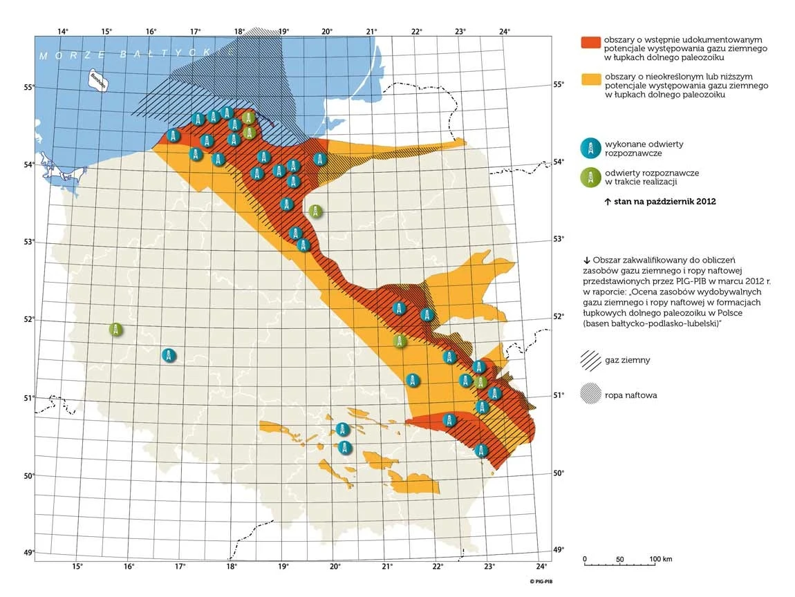 "Pas łupkowy" według badań obejmował zaś ok. 37 tys. km², tj. 12 proc. obszaru Polski, rozciągając się od północnych obszarów kraju (basen bałtycki - uznawany za najbardziej obiecujący i skupiający większość projektów), przez regiony centralne (basen podlaski), po wschodnie (basen lubelski). W tym samym roku Państwowy Instytut Geologiczny wydał raport, w którym oszacował, że wielkość polskich złóż z największym prawdopodobieństwem mieści się w przedziale 346-768 miliardów m³, przy szacunku minimalnym 38 mld m³ i maksymalnym rzędu 1,92 bln m³.