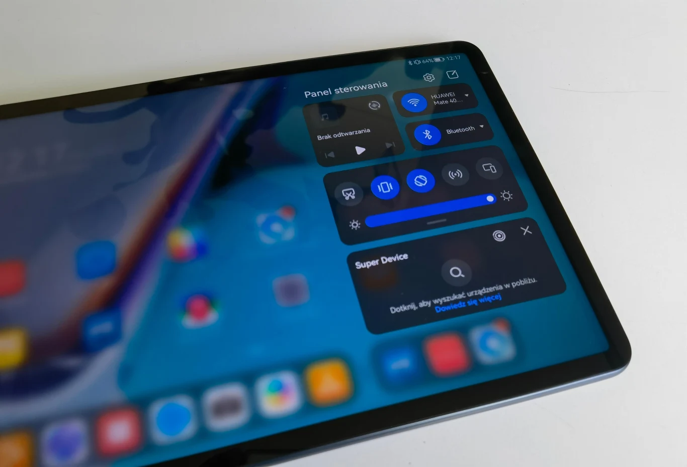 Po przeciągnięciu palca z góry, z prawej części ekranu, zobaczymy Panel sterowania z kilkoma kluczowymi opcjami: ustawienia Wi-Fi, BT, najważniejsze aktywne funkcje, odtwarzacz muzyczny i Super Device (ten ostatni ma sterować innymi inteligentnymi urządzeniami z HarmonyOS).