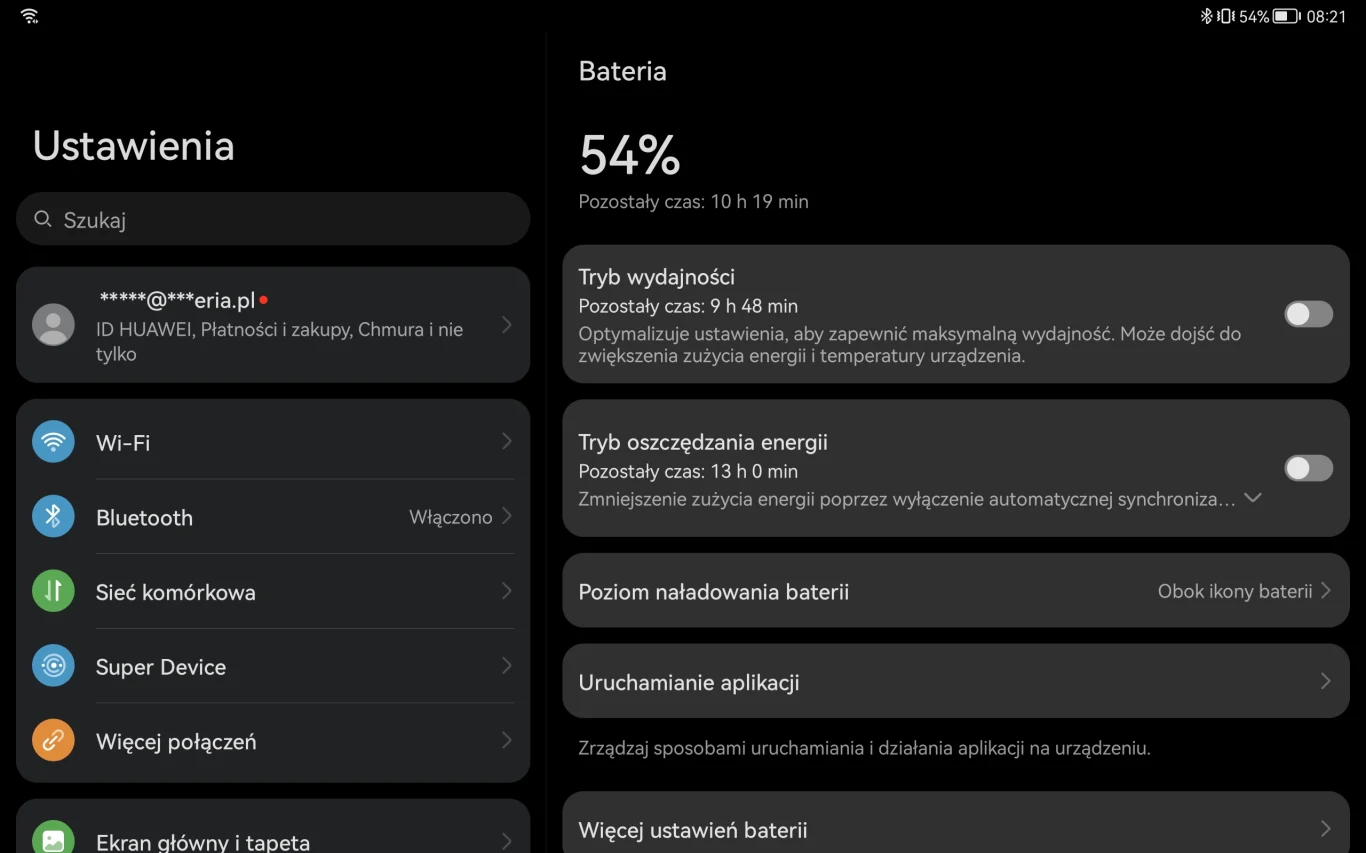 Huawei zdecydował się na zastosowanie ekranu IPS LCD o przekątnej 11 cali (właściwe 10.95 cala). Wyświetlacz oferuje rozdzielczość 2560 na 1600 pikseli (276 ppi) i nominalną jasność około 500 nitów. Ekran ma częstotliwość odświeżania do 120 Hz - możemy wybrać tryb Dynamiczny, który płynnie przejdzie pomiędzy 60 Hz a 120 Hz, zależnie od tego, co pojawia się na ekranie. Sam wyświetlacz może się pochwalić dobrą rekonstrukcją kolorów, udanym kontrastem i ostrością. Jak na sugerowaną cenę, jest to dobra propozycja. W ustawieniach wyświetlacza znajdziemy m.in.: tryb e-książki, który uruchamia wersję czarno-białą ekranu - przydatne rozwiązanie dla czytających na tablecie książki, gazety lub czarno-białe komiksy.