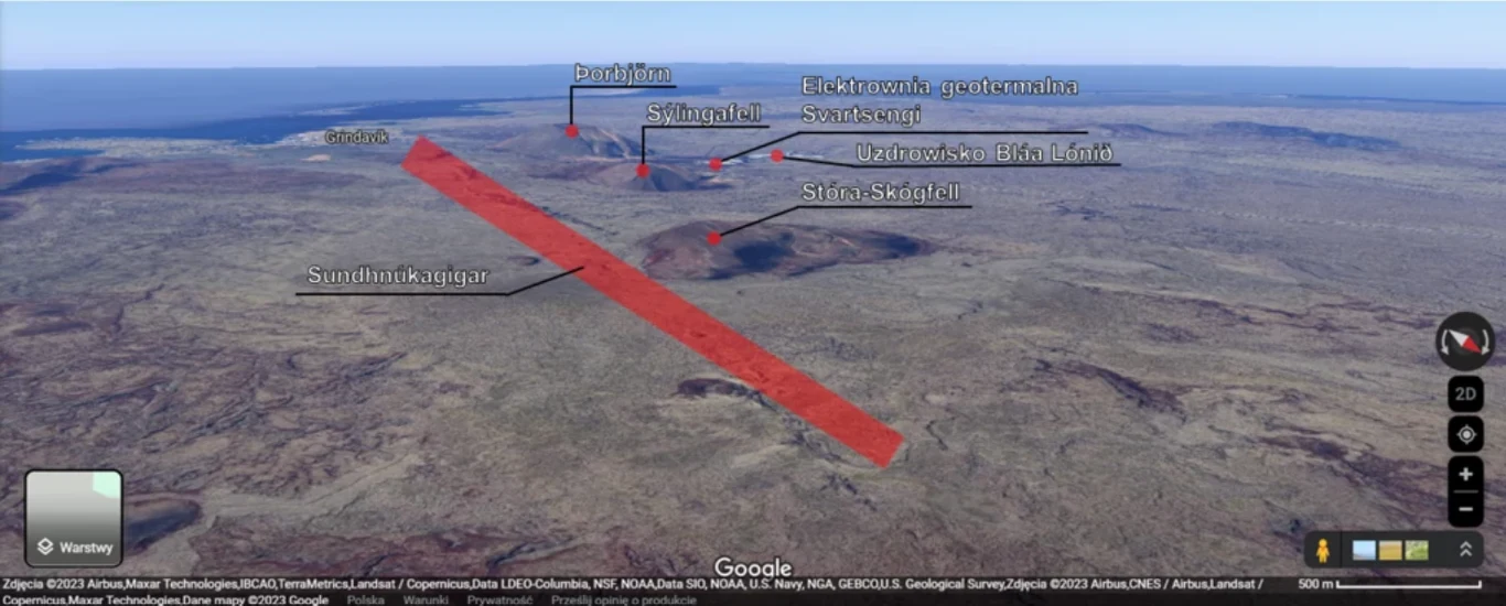 Obecny wypływ magmy ma miejsce w serii kraterów Sundhnúka zlokalizowanych na północny wschód (a dokładniej NNE) od Grindavíku. Zdarzenie miało miejsce w południowo-zachodniej części kraju, na półwyspie Reykjanes, zaledwie kilkadziesiąt kilometrów od Reykjavíku. Region wyróżnia położenie geologiczne. Jest to granica pomiędzy płytami tektonicznymi: północnoatlantycką na zachodzie i eurazjatycką na wschodzie. Nachylenie terenu sprawia, że lawa spływa w kierunku miasta, w wyniku czego konieczna była ewakuacja ludności.