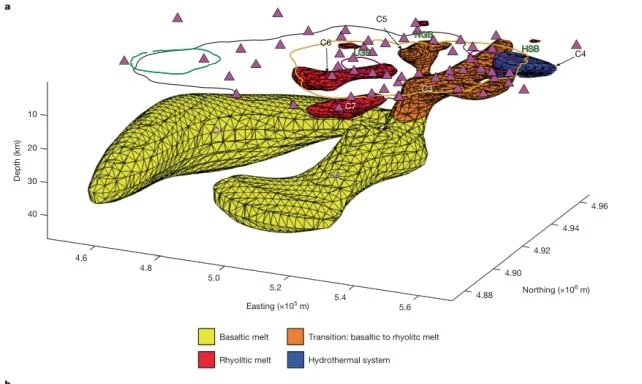 Okazało się, że istnieje przynajmniej siedem obszarów o dużej zawartości magmy na głębokości od 4 do 47 kilometrów. Część z nich zasila się wzajemnie. Uwagę badaczy zwróciły te zlokalizowane na północnym wschodzie. To właśnie tam ogromne zbiorniki magmy bazaltowej utrzymują i stale podgrzewają magmę ryolitową o szacowanej objętości od 388 do 489 km sześc. To znacznie więcej, niż komory na południu, zachodzie i północy, gdzie miały miejsce poprzednie erupcje.
