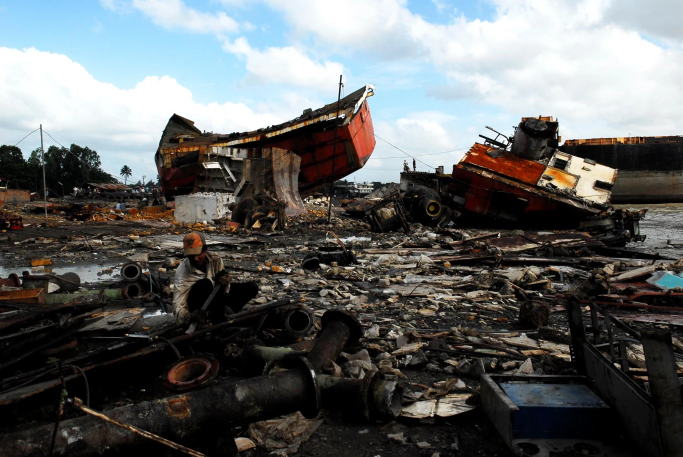 Bez odzieży ochronnej, wyposażeni w palniki spawalnicze i młoty kowalskie robotnicy rozkładają na części masywne stalowe fragmenty statków. Za 14 godzin spawania, walenia młotem i dźwigania ciężkich elementów ludzie pracujący przy złomowaniu otrzymują równowartość niecałych 10 złotych.