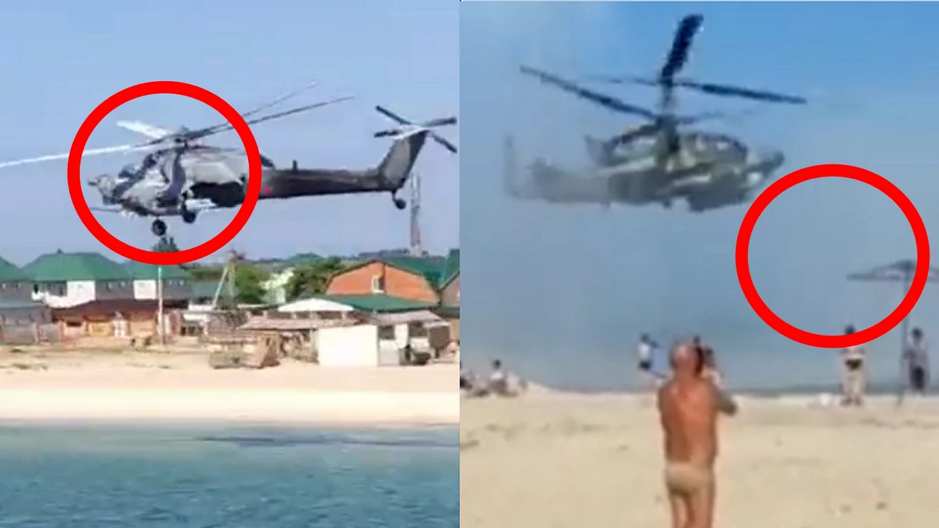 Można śmiało rzec, że rosyjscy piloci dosłownie terroryzowali Rosjan, ponieważ na kilku materiałach filmowych o mały włos, a doszłoby do tragedii. Na pierwszym ujęciu dwa śmigłowce Mi-28 przelatują wzdłuż plaży na tymczasowo okupowanym Krymie. Jest to plaża, na której wypoczywają Rosjanie. Można zobaczyć, jak plażowicze wstają z leżaków i plaży na równe nogi i próbują zorientować się, co się dzieje.