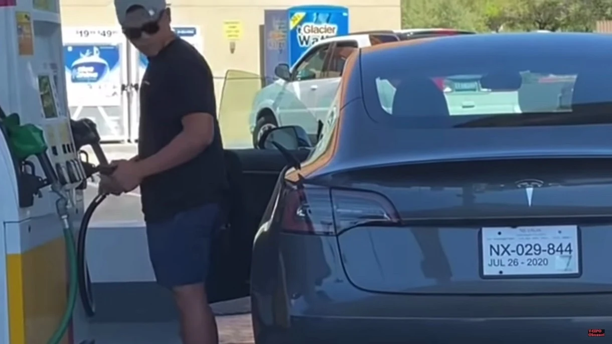 Elektryczna Tesla stanęła, wtedy właściciel zatankował ją benzyną i wyruszył w drogę [FILM]